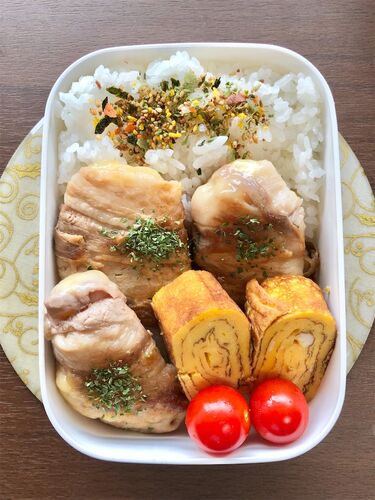 みなさん、こんにちは! あめです 今日はお弁当の日でした。 じゃがいもとチーズの肉巻き 卵焼き(甘) プチトマト ご飯に野菜ふりかけ じゃがいもとチーズの肉巻きはクラシルのCMを見て、美味しそうだったので作ってみました✨ 緑要素なかったので苦し紛れに…